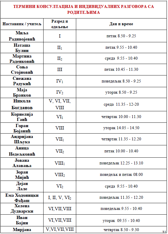 Циљ индивидуалних разговора са родитељима је првенствено отворена комуникација наставника и родитеља, са истом жељом да се успостави боља сарадња и пре свега помогне сваком ученику. Такође, родитељ који је био спречен да присуствује родитељском састанку на овај начин се може упознати са темама и закључцима састанка.